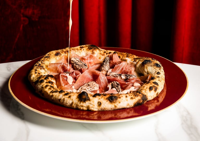 Our Neapolitan sourdough begins 48 hours before it ever touches the oven. We stay loyal to tradition — high hydration dough, hand-stretched only, blistered in intense heat until the crust rises into that iconic leopard-spotted cornicione.
